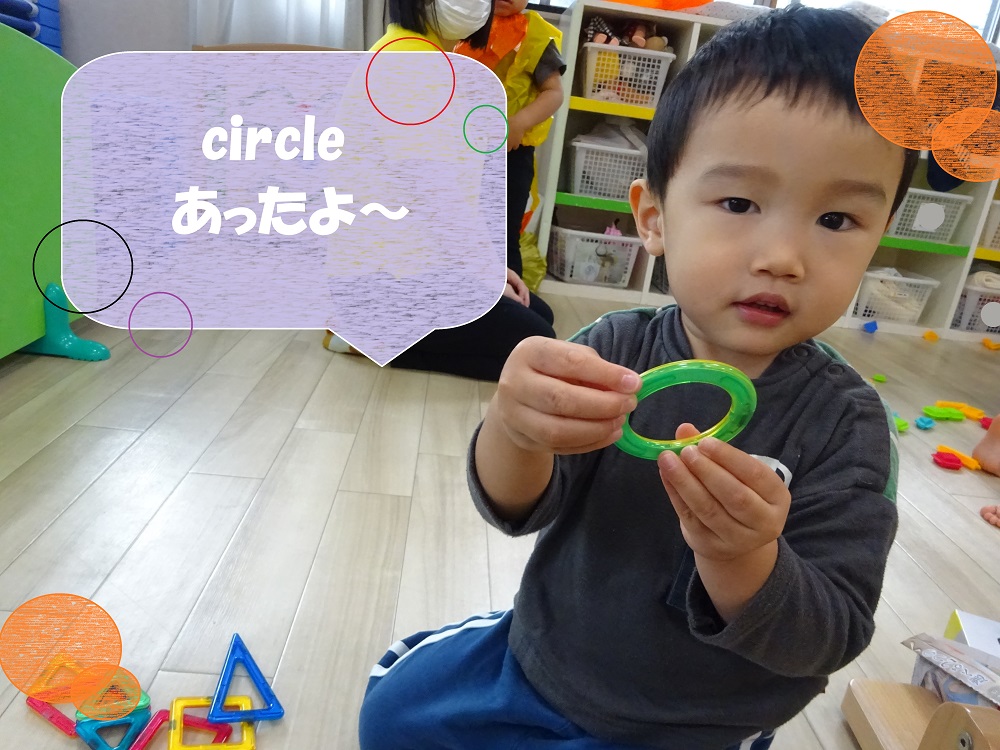 また、マグネットブロックで遊んでいると「みて!Circle!」と教えてくれたり、「Diamond!」と見つけた形を先生に渡しに来てくれています😊