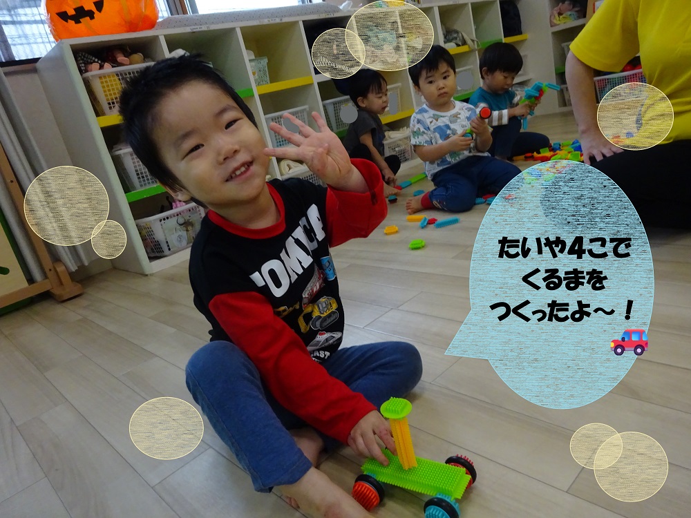 ブロックで遊んでいる際、シリウス組(2歳児)さんは、の車を作りながら「車のタイヤは4個だよね!」と言い、4つの車輪で車を作り上げています🚗
