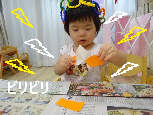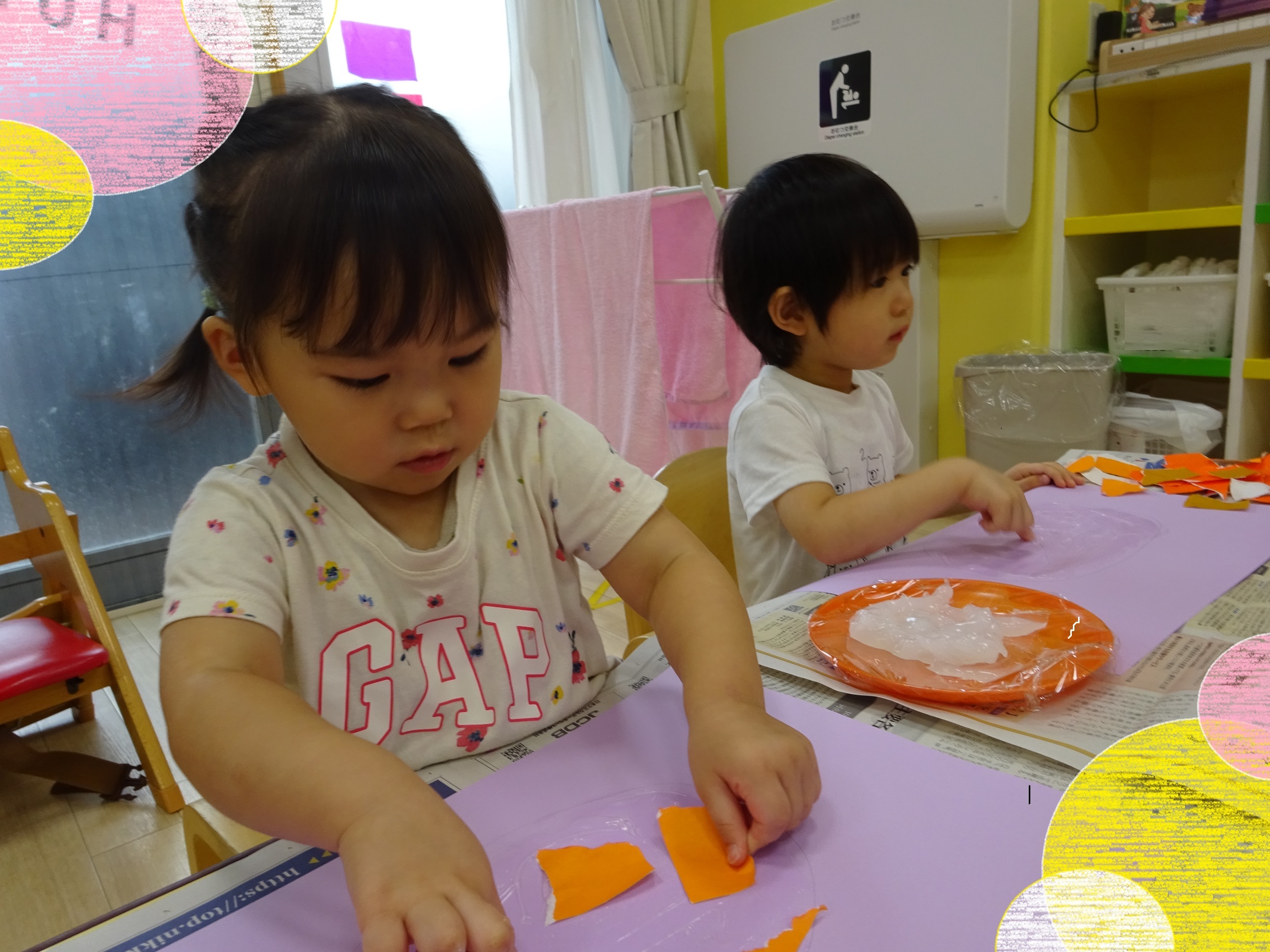 製作では折り紙を千切ってみたり、指にのりを付けて塗り広げ思い思いに表現していきます♪