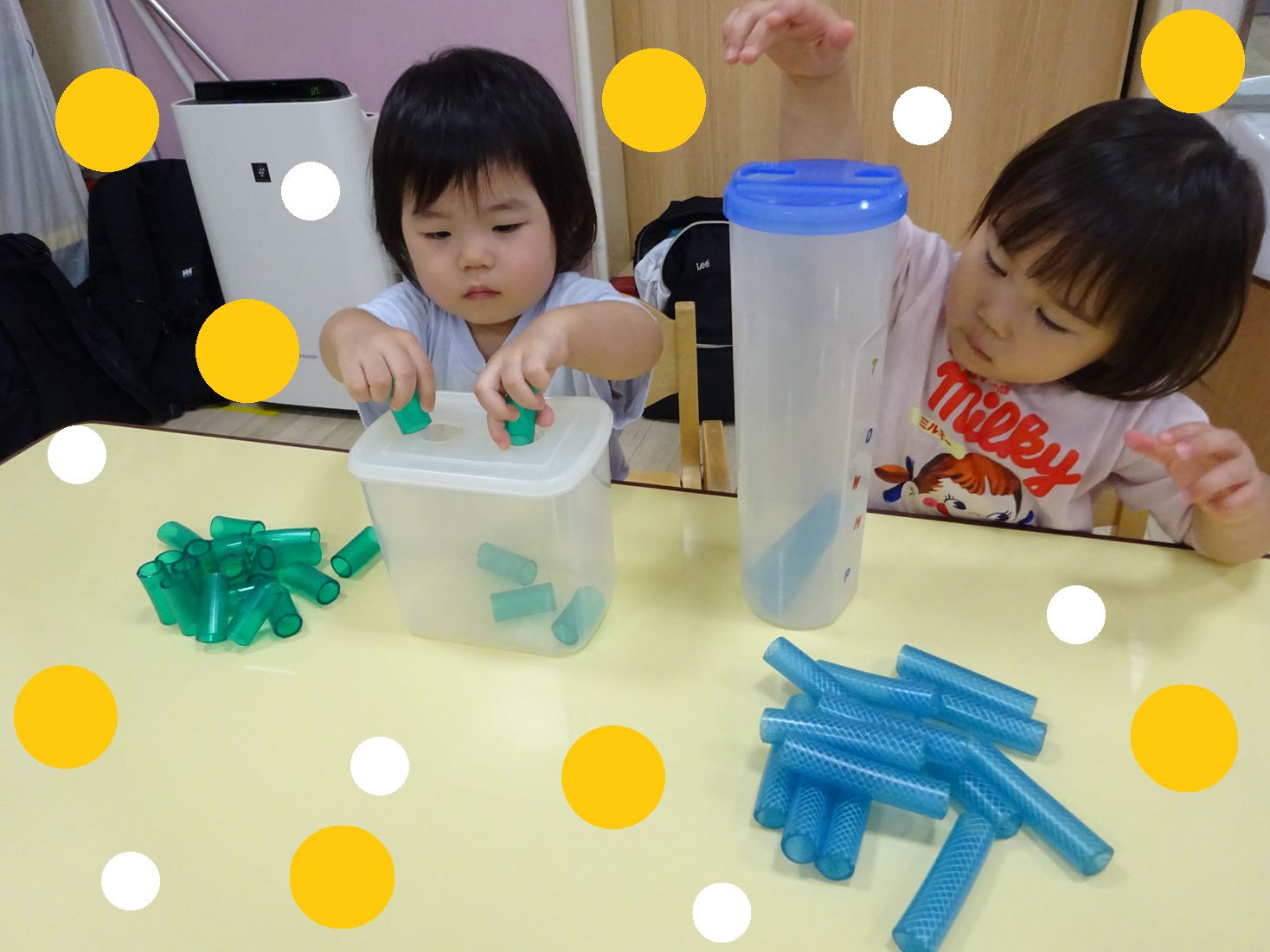上手に摘まみ、入れる事ができたりブロックをくっつけたりと手先、指先がどんどんと器用になってきました😊