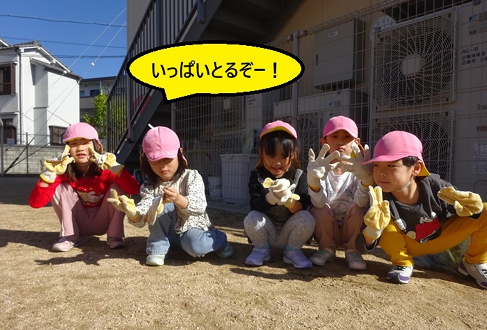 まだまだ半信半疑の子どもたちですが、しっかり保育士の説明を聞いて軍手をつけて「大きいのを取るぞー」とやる気満々です!