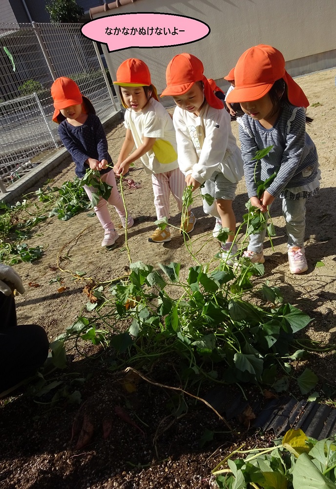 お友だちとつるを持って力いっぱい引っ張ってもなかなかさつまいもは見えてきません。