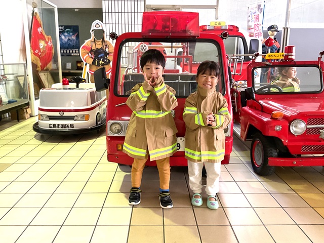 大好きな消防隊のお兄さんと同じ服を着れて、嬉しそうな子どもたち。