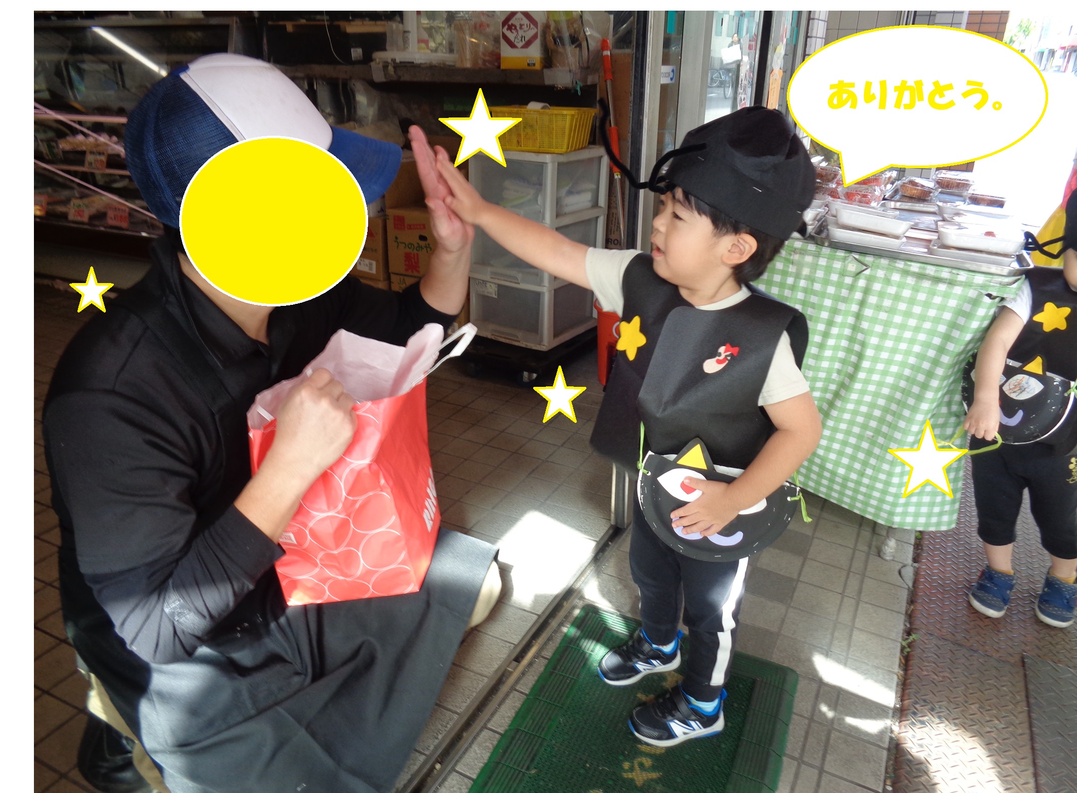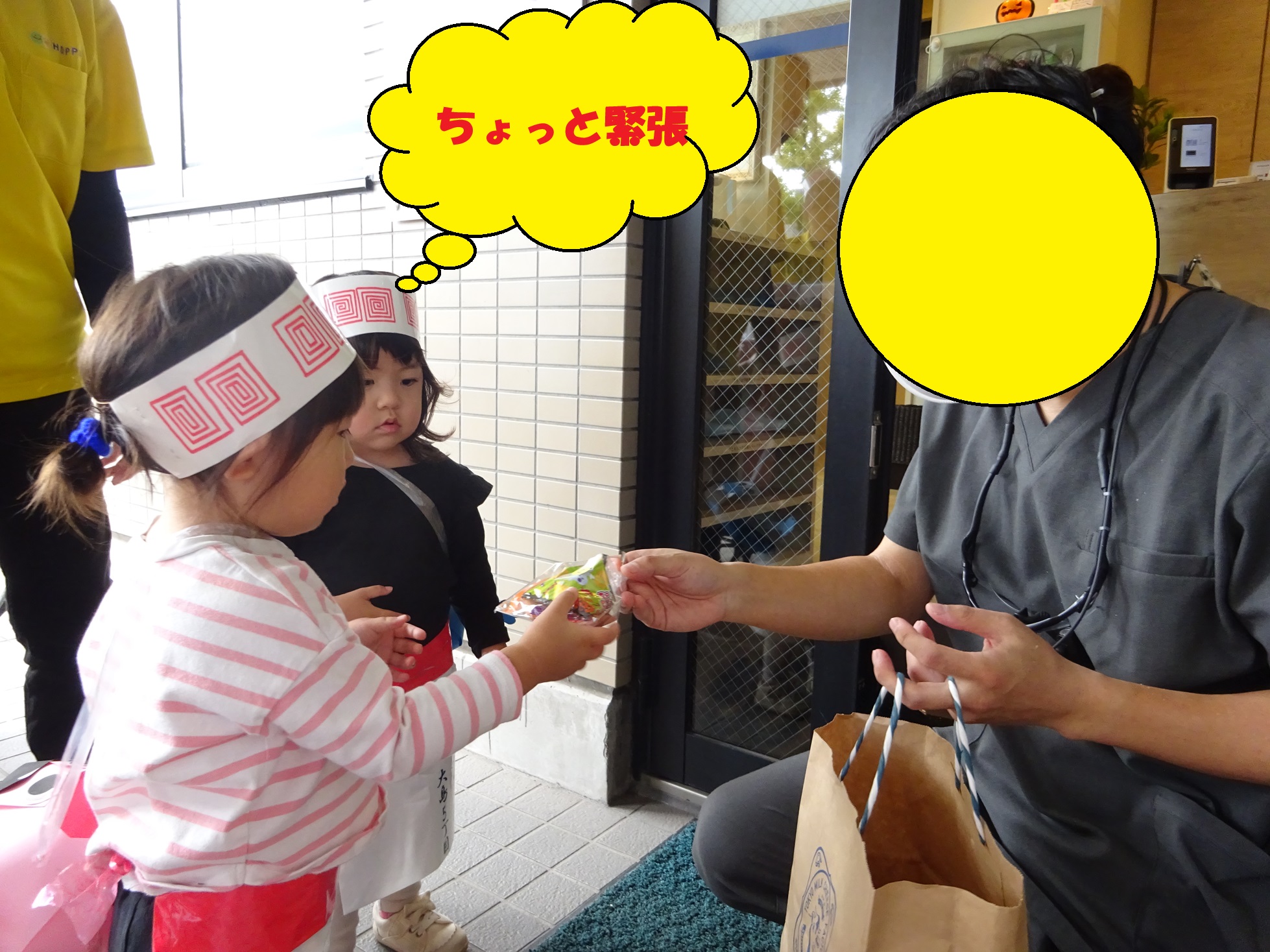 近所のお店屋さんに着くと「trick or treat!」「お菓子をくれないといたずらしちゃうぞ!」と英語で言うと、お店屋さんの方からお菓子をもらう事ができました🍪🍭