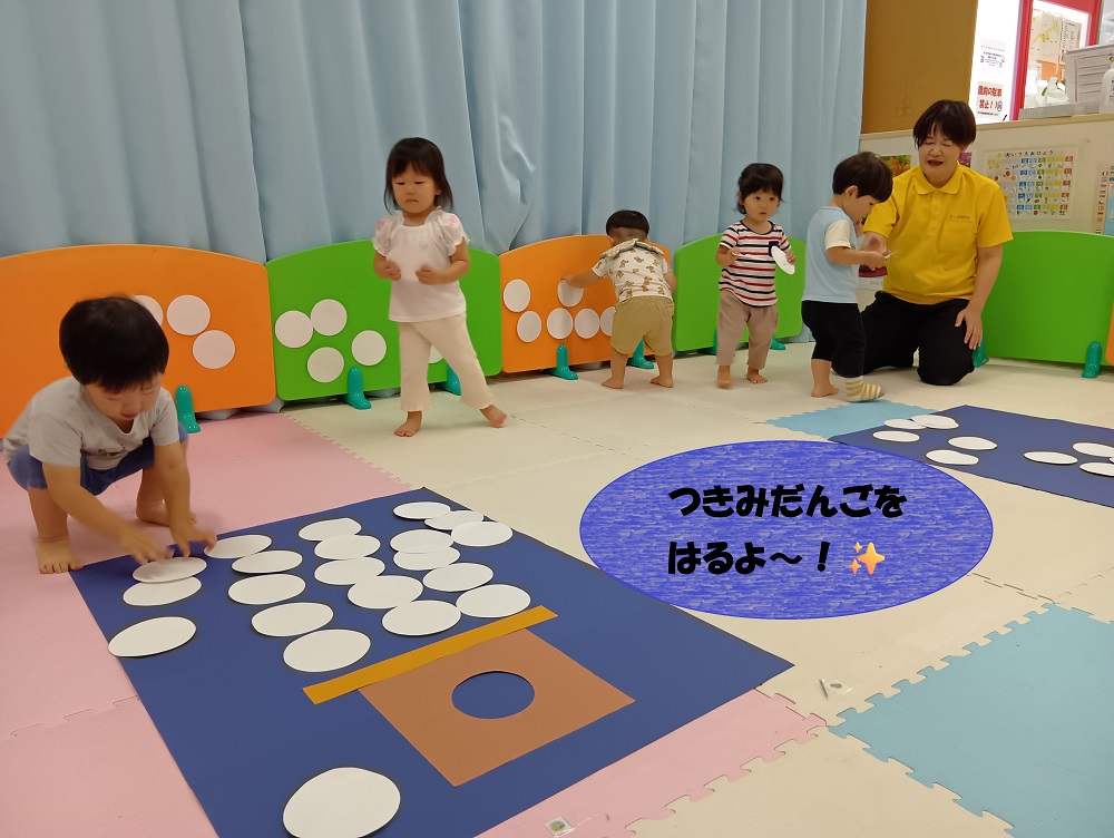 そしてお月見のときに飾るものはお団子!ということで「つき」を歌ってからみんなで大きな三方の上にお団子をペタペタと貼り付けました!