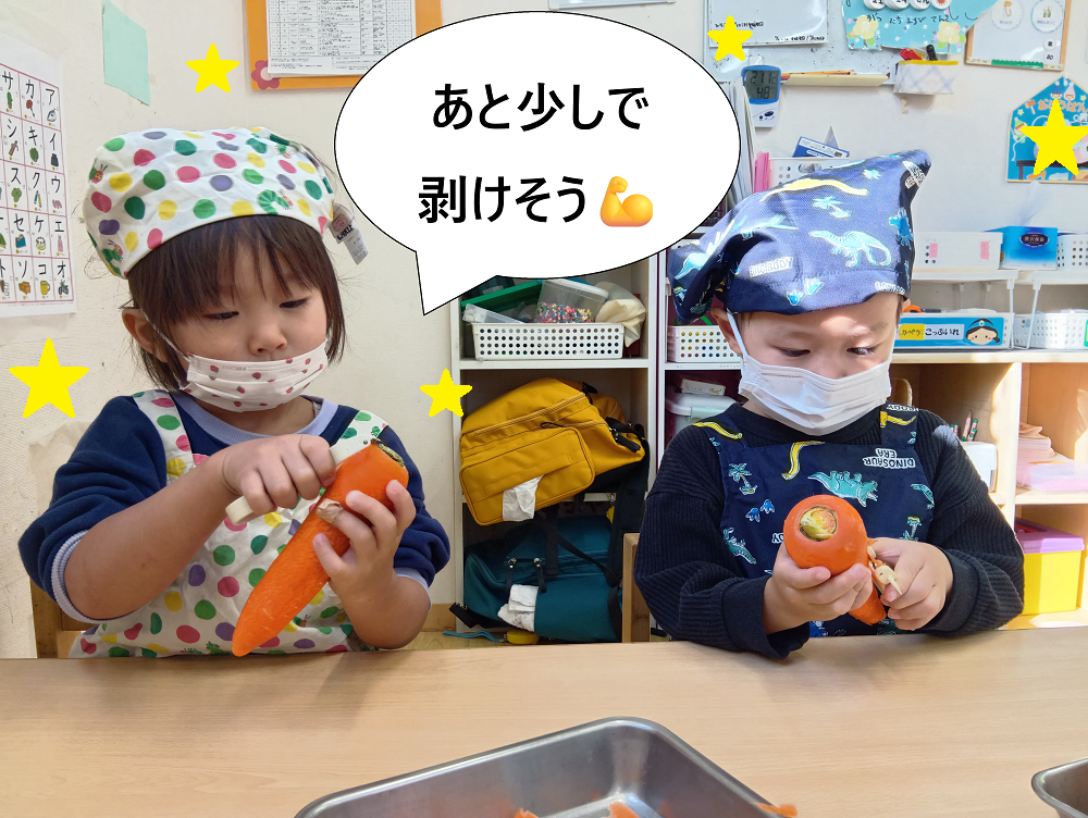 ピーラーを使ってカペラクラス(3歳児)は人参の皮むきをしています✨