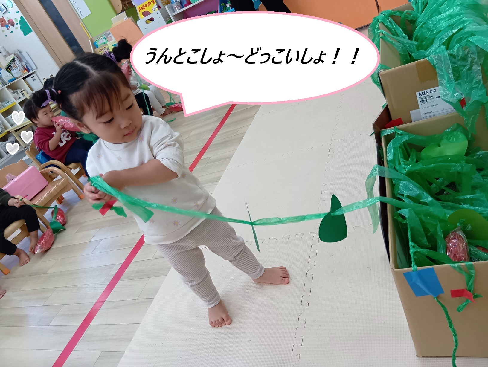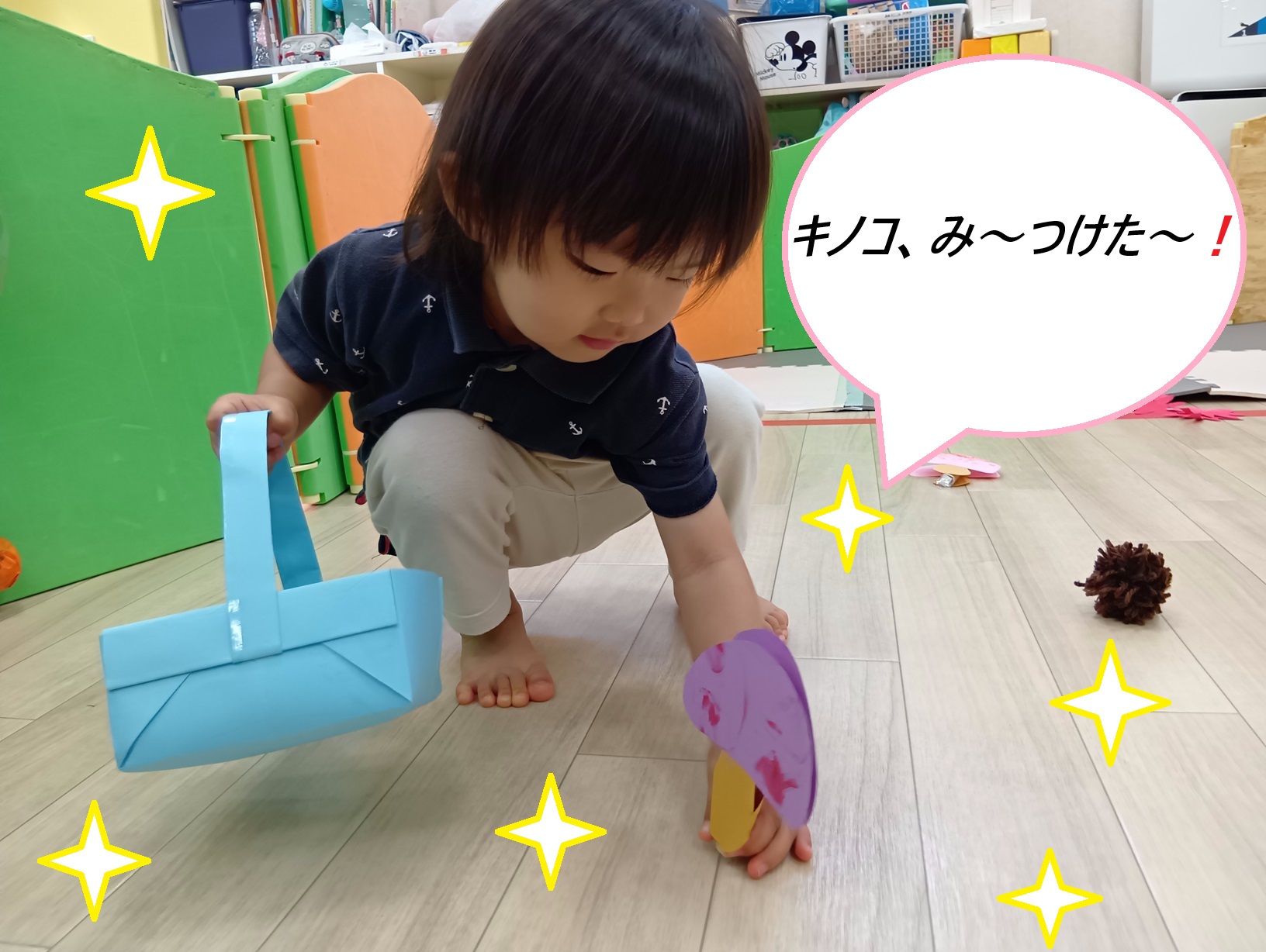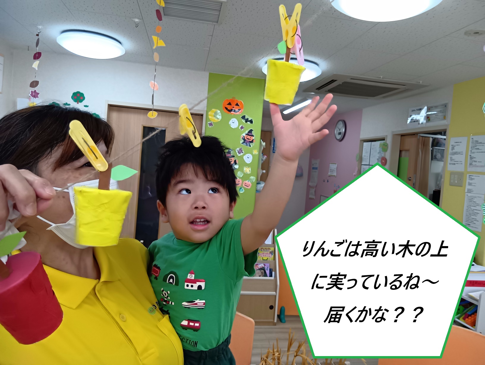 今回は子どもたちが製作した果物を使って「果物狩りごっこ」をしました。