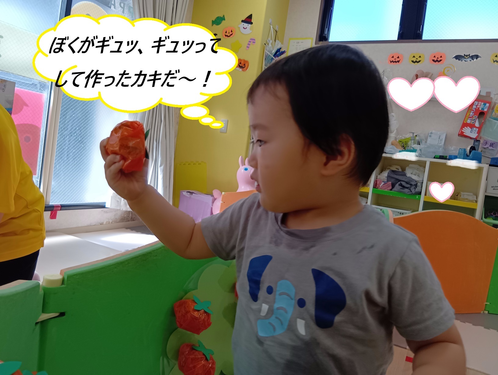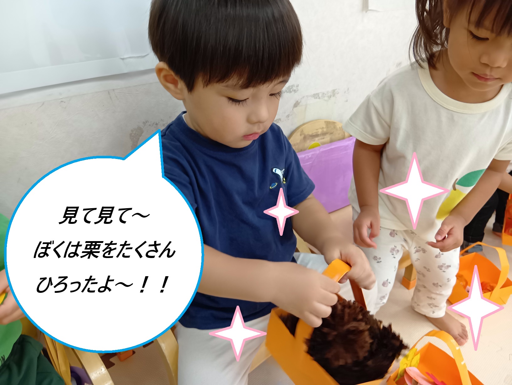 そこで、保育士から「本物も見せたい!」との声が上がり、枝付きの柿やイガに入ったままの栗を用意しました✨