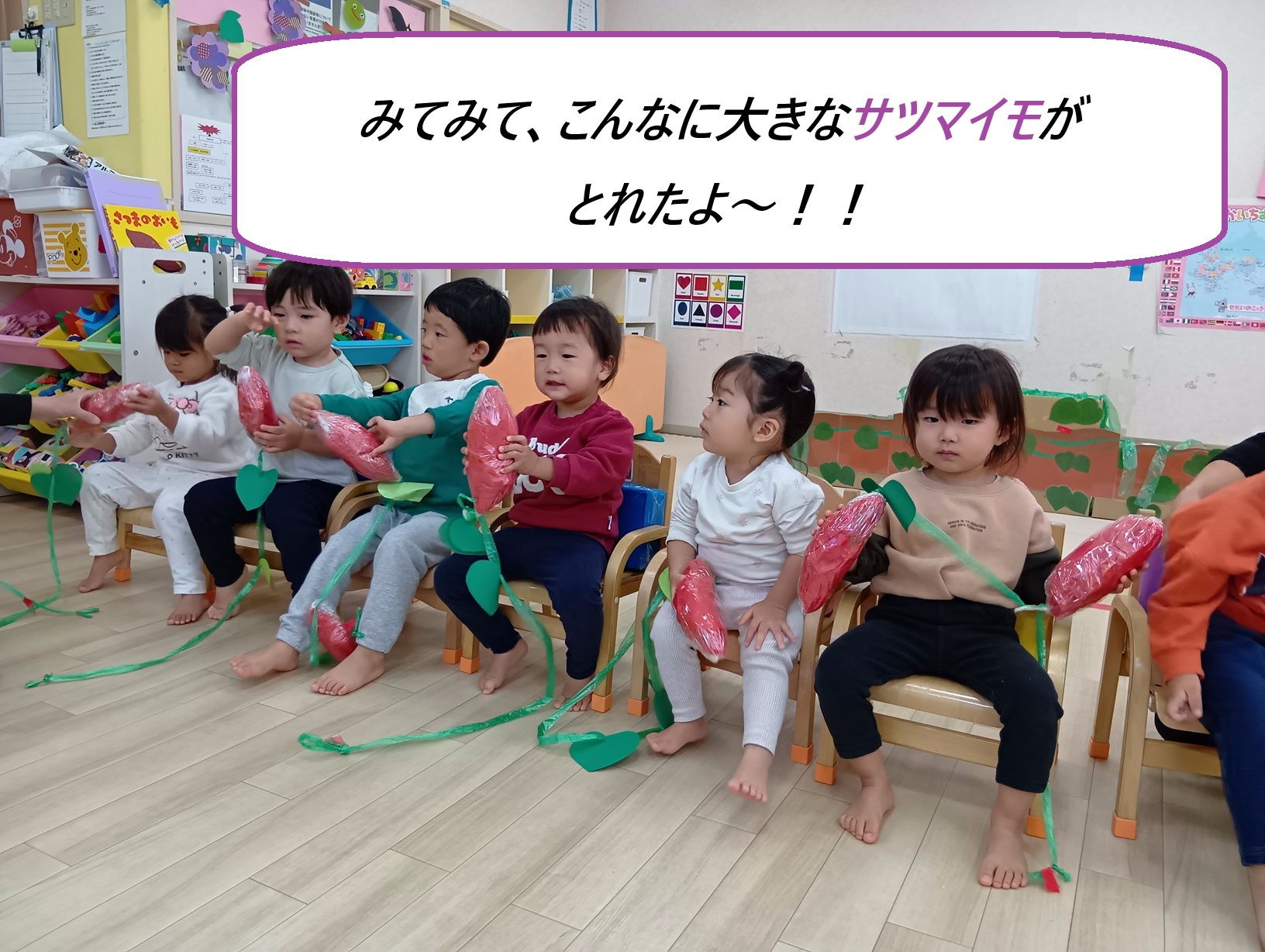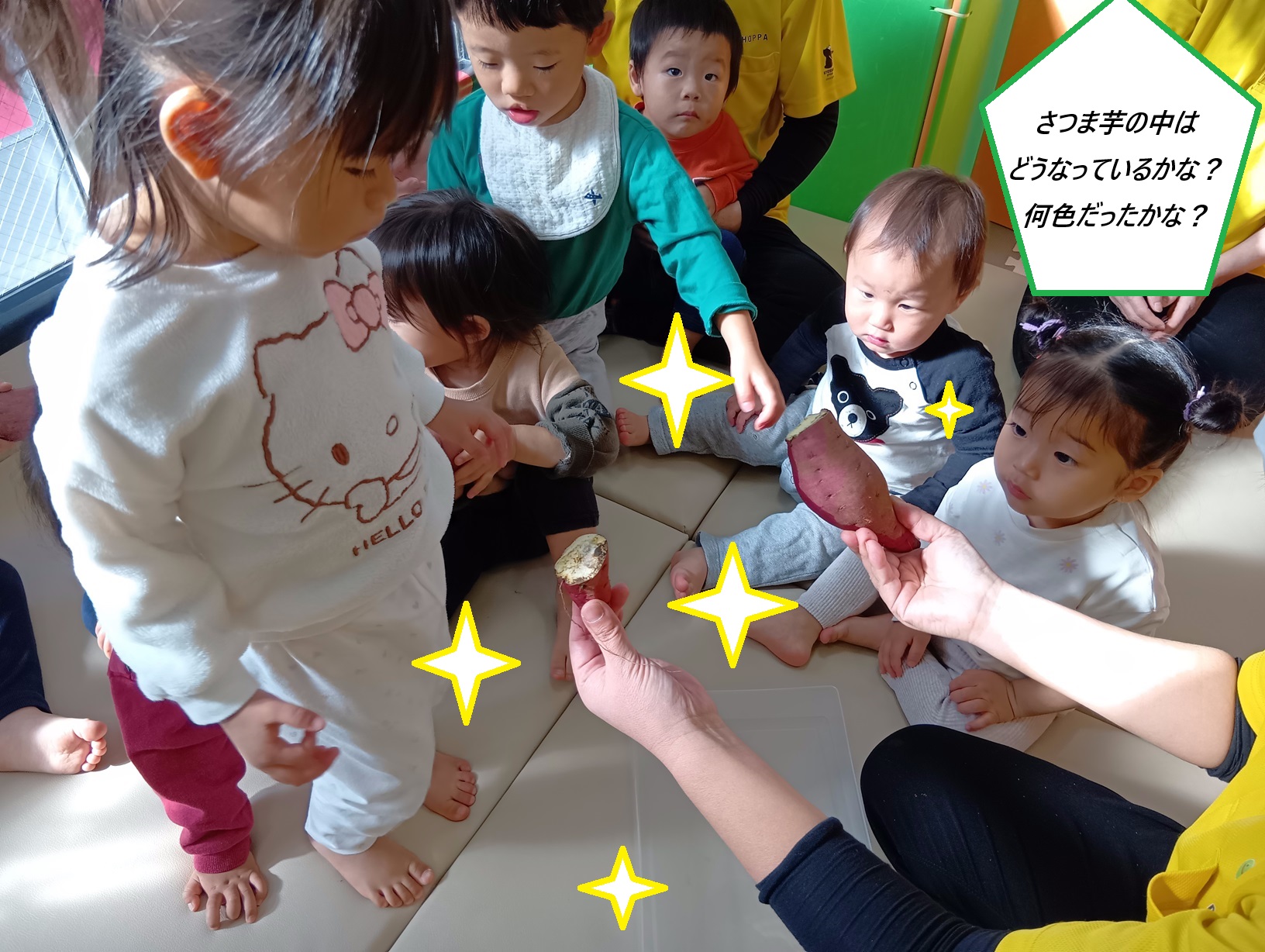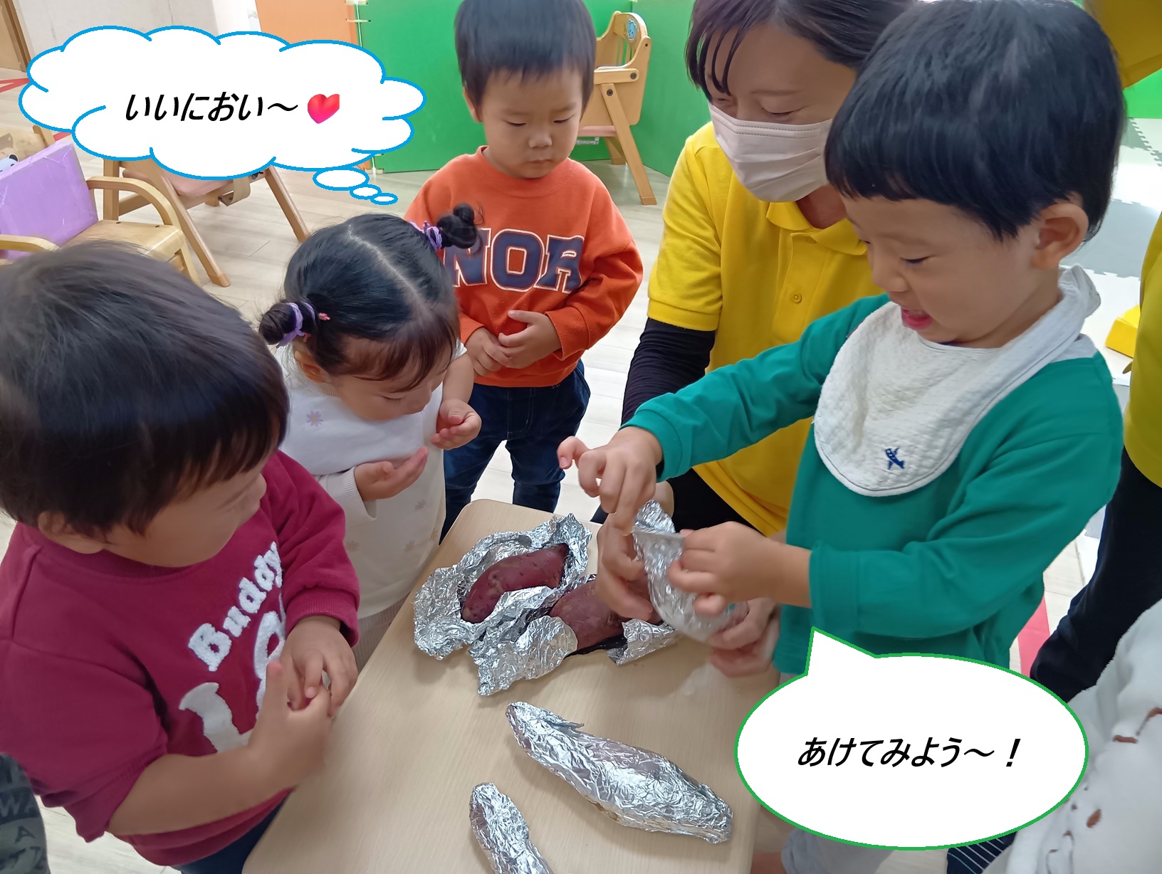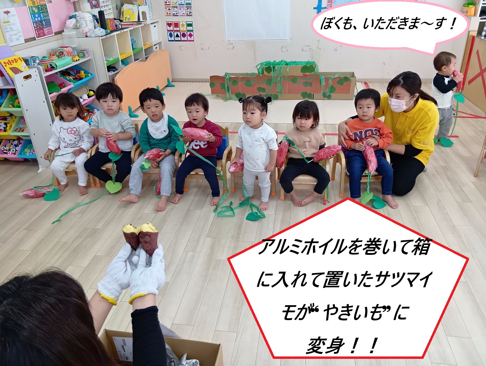 この日は食育を交えながら“いもほりごっこ”をしてサツマイモが焼きいもになるまでを体験しました。