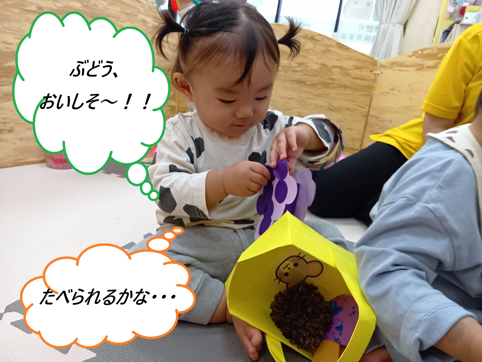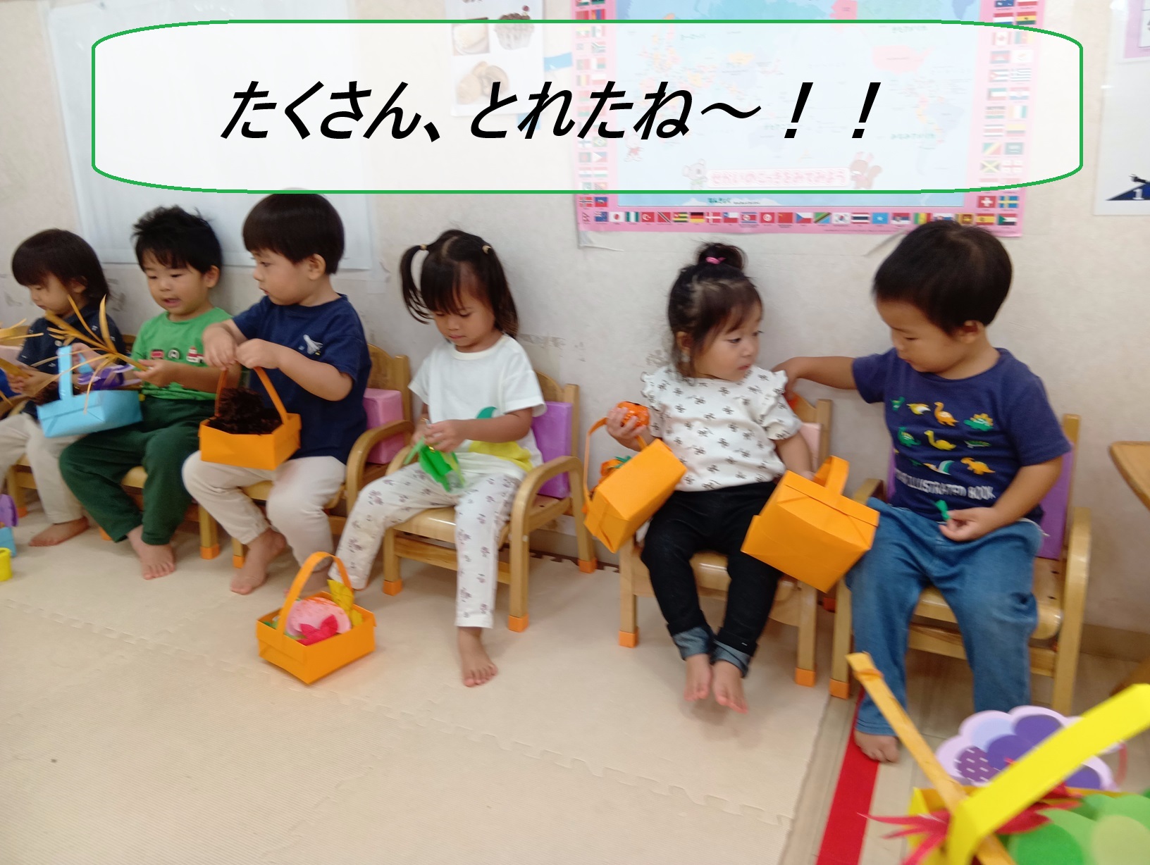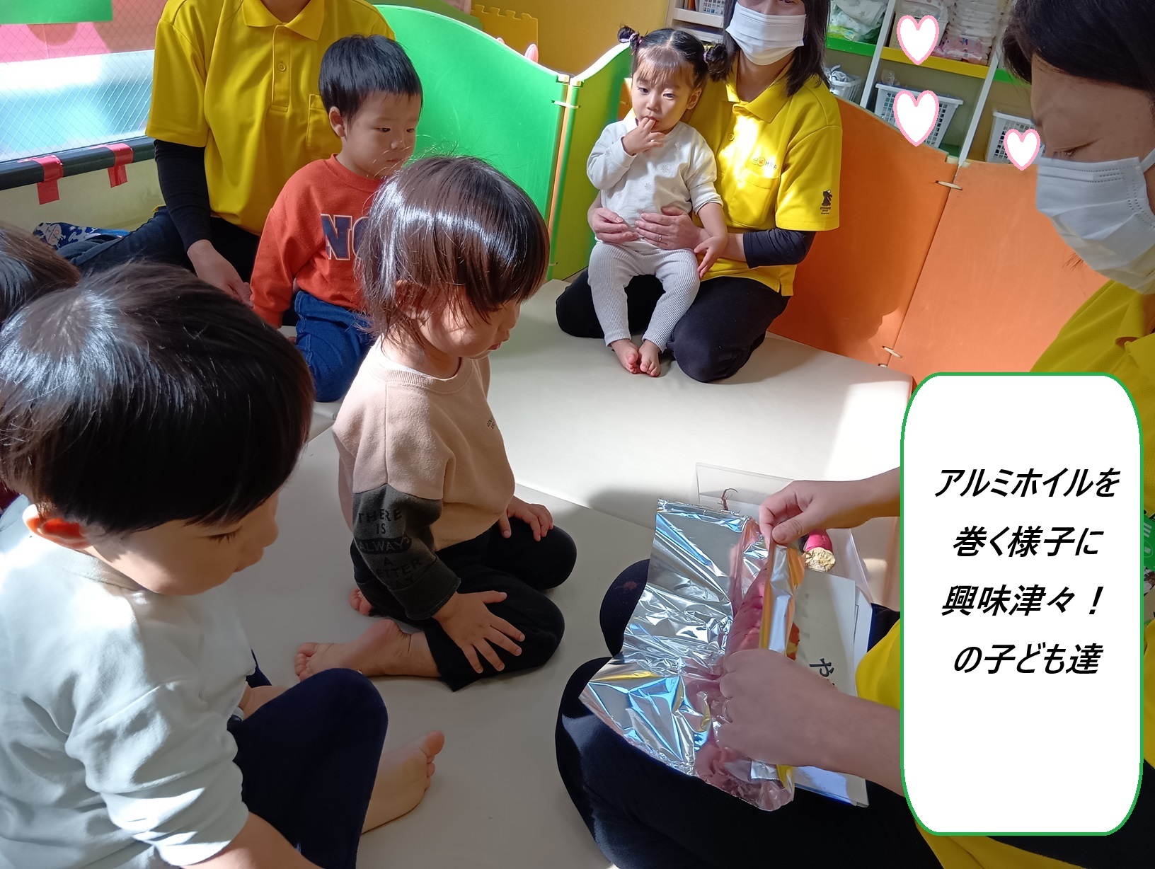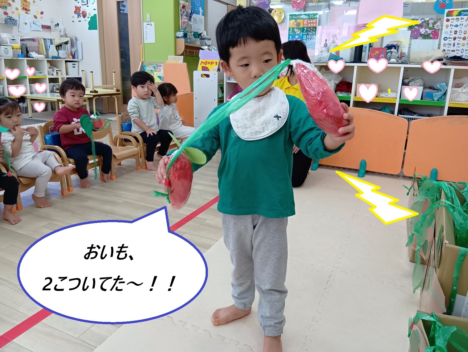 この日は食育を交えながら“いもほりごっこ”をしてサツマイモが焼きいもになるまでを体験しました。
