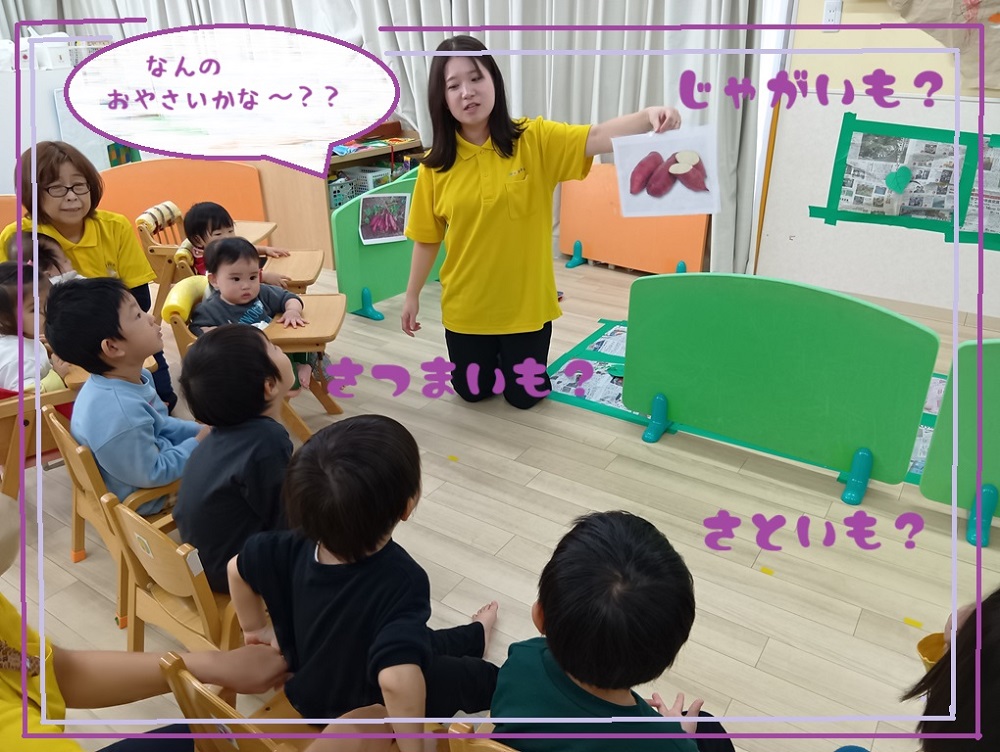 保育者の「これなんだ?」の問いかけに「やきいも!!」と元気よく答える子どもたち!