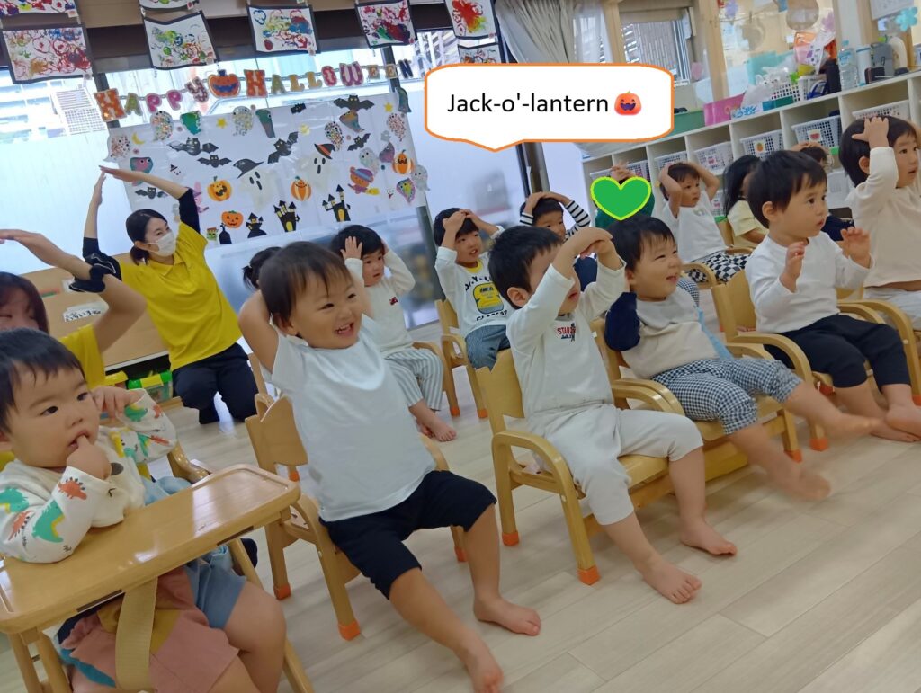 Englishでは、English teacherがハロウィンにちなんだ単語や音楽を用意してくれているので、皆で楽しく復唱したりお歌を歌ったり、身体を動かしたりしました👻