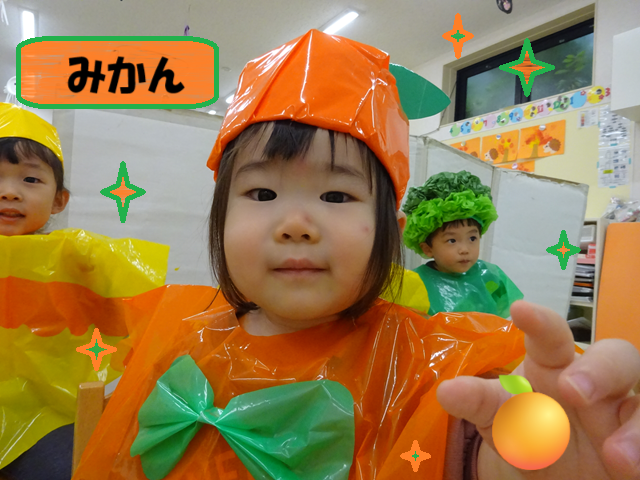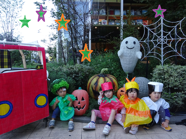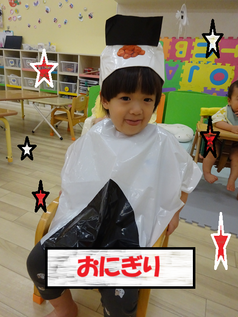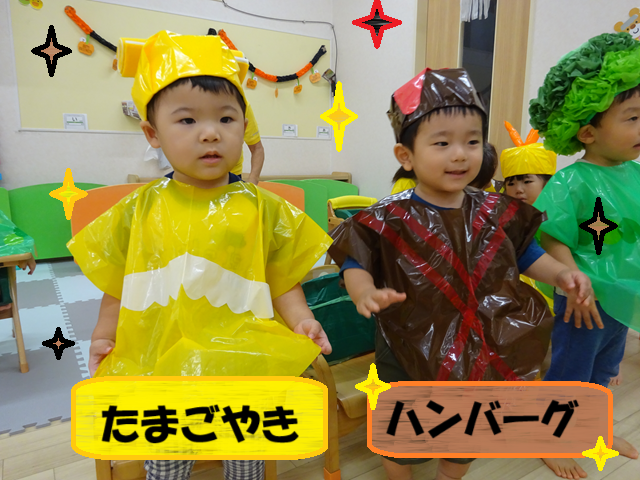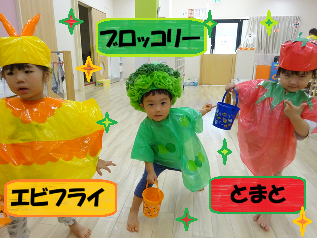 今年は、子どもたちが大好きな絵本「おべんとうバス」からエビフライ、ブロッコリー、トマト、たまごやき、ハンバーグ、みかん、おにぎりに変身です!