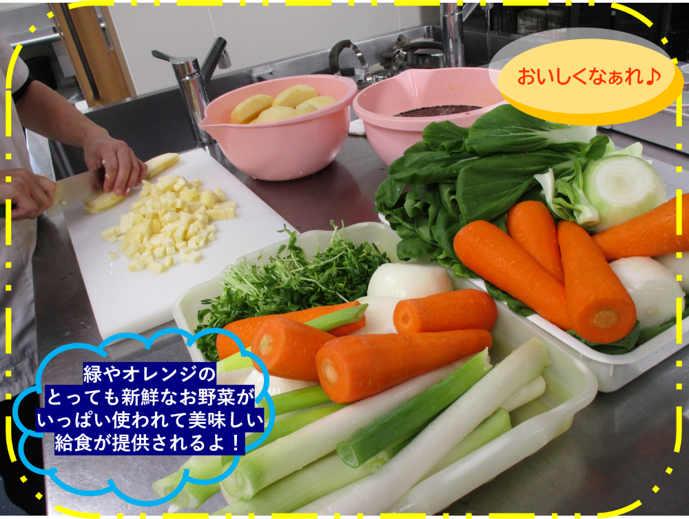 HOPPAでは調理の先生が色とりどりの新鮮なお野菜を使って、栄養のバランスの取れた美味しいお給食を作ってくれています🍴