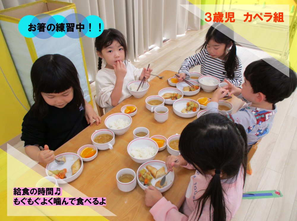 カペラ組(3歳児)の子どもたちは、「この緑の野菜いやだ~」「いっぱい野菜入ってる…」と苦戦しながらもお友たちが一口食べて「すごーい!」と褒められ得意げな様子を見ると、野菜が苦手と言っていた子も次々に「先生みてて!!」と一口挑戦し、見た目以上に美味しいことが分かって「食べられる~!!」と嬉しそうに半分をペロリ😋