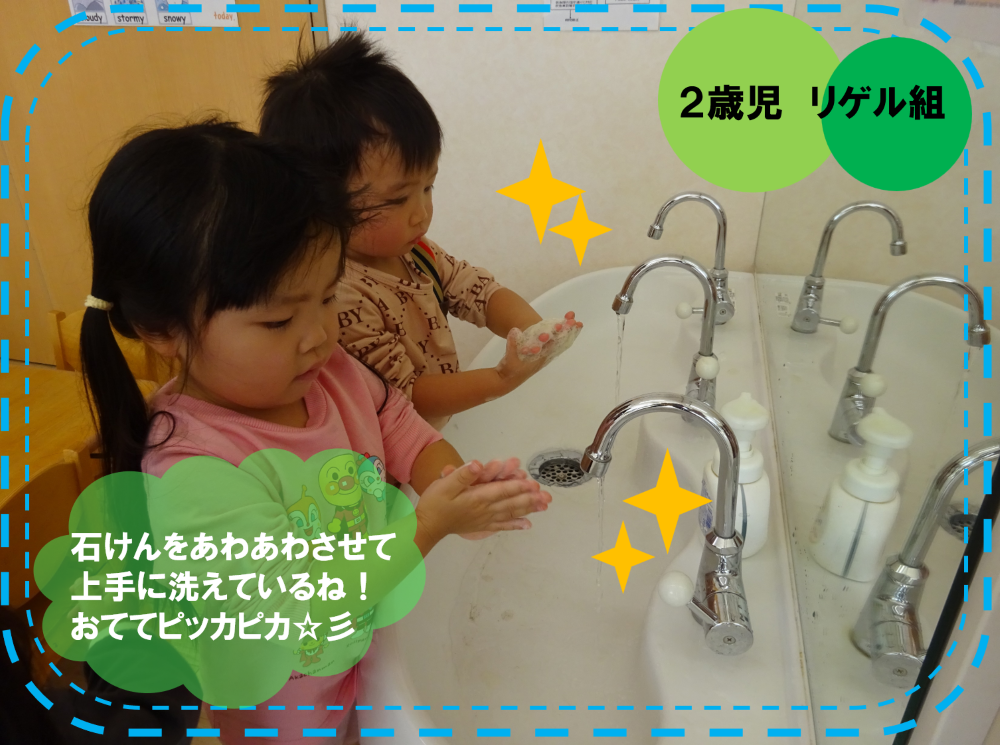 リゲル組の子どもたちも、手のひらはもちろん、指と指の間や手首までしっかりと洗えるようになり、よく水ですすぎ綺麗な手になると「みて~!ぴかぴかになったよ!」とニッコリ笑顔で保育士に見せてくれます✨