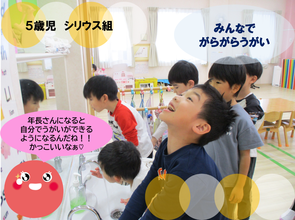 年長シリウス組(5歳児)の子どもたちは、手洗い時にお友だち同士で「ここも洗うんだよね!」と忘れがちになってしまう指の間まで声を掛け合い丁寧に手洗いしたり、「みんなうがいもちゃんとした?」と友だち同士で確認し合ったりと、意識高く取り組んでいますよ😊✨