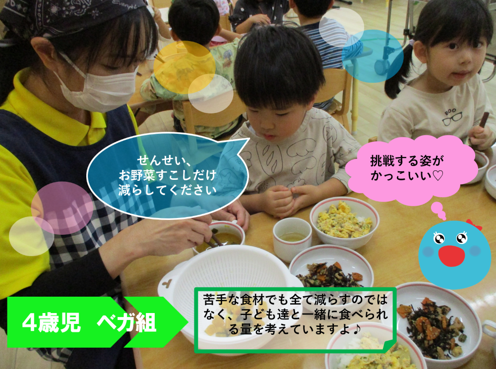 ベガ組(4歳児)の子どもたちも、苦手な食材がある時や満腹感を感じた時などは保育士に対し食べられる量を自分で伝え、「苦手なものも…!」とチャレンジした時は、とても嬉しそうに友だちや保育士に伝えてくれます😊✨