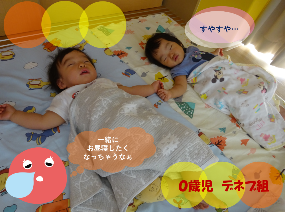 1番小さなデネブ組(0歳児)の子どもたちは、給食後お布団の上でゆったりと午睡の時間を過ごしています。