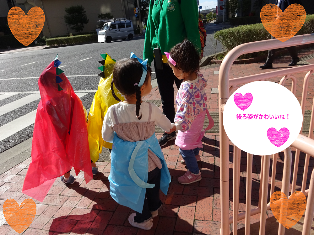 0歳児、1歳児、2歳児の担任の保育者が、どんな衣装を作るか考え、衣装を作り、子どもたちが衣装を着て、みんなで手を繋いでお散歩に行きます。