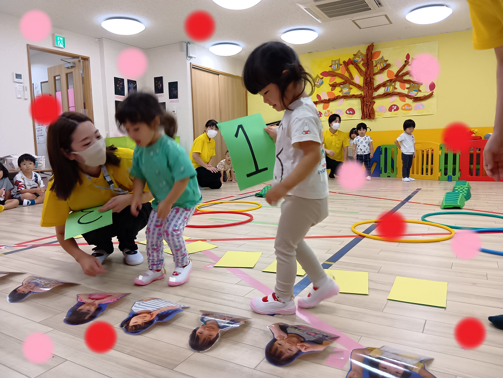 親子競技では普段行っている知育の内容も取り組み、数字カードを引き同じ数字のボードに自分の写真を貼りました!