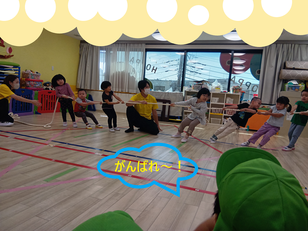 バスタオルを使って膝を曲げて引くことを覚え、みんなで力を合わせて綱を引っ張る練習をたくさんしました🎶