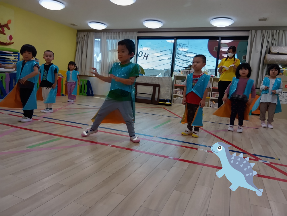 ダンスで怪獣の衣装を着る事が楽しみだった子どもたちは、最後の予行練習で念願の衣装を着てかわいい怪獣に変身~🦖