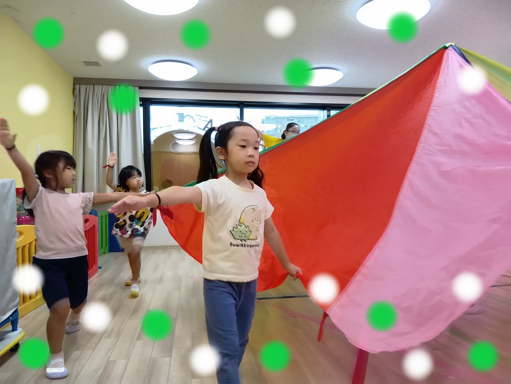 パラバルーンでは動きを合わせてバルーンを膨らませる事がはじめは難しかったけれど何度も練習を重ねて、みんなで息を合わせて動き、キレイにパラバルーンを膨らませる事ができるようになりました❤