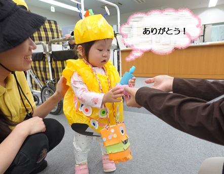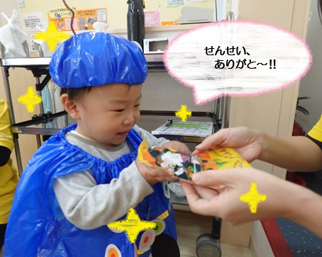 今度は本物のお菓子をもらって、子どもたちの目はお菓子に釘付けでした。