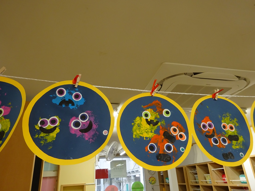 シリウス組(2歳児)は、絵の具をティッシュにつけてモンスターのスタンピングをしました。