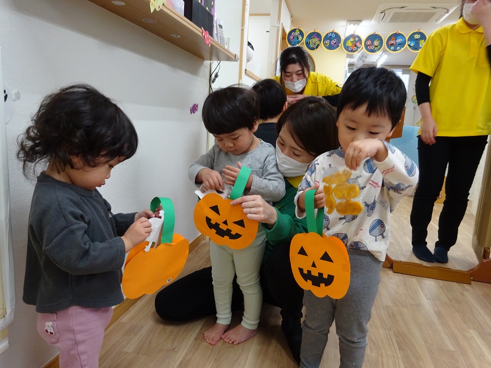 スピカ組(0歳児)は、ハンドペインティングで彩色したかぼちゃに目と口をつけたり、足形を取っておばけにしました。