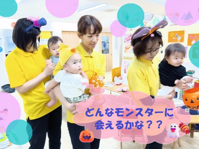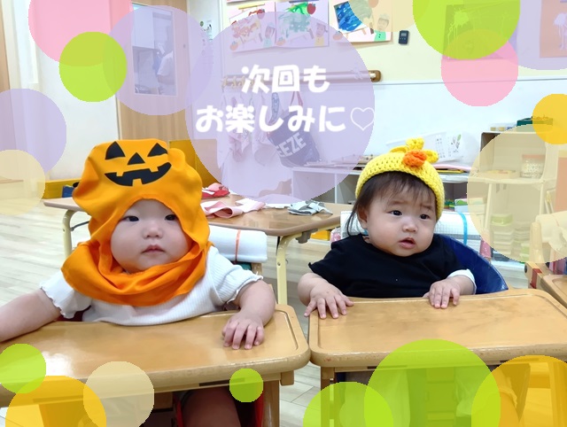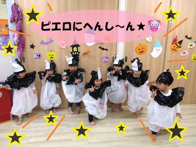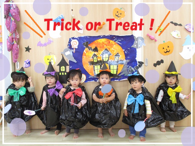 絵本で由来を聞いたり、可愛い衣装を身に付けたり、英語の挨拶「トリック・オア・トリート!」をまねしながらお菓子をもらうやり取りを楽しむ姿が見られました。