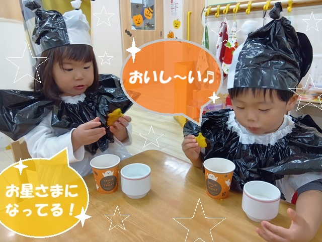 シリウス組は、衣装を着て「トリック・オア・トリート!!お菓子くれなきゃいたずらしちゃうぞ~!」と調理室におやつを受け取りに行きました。