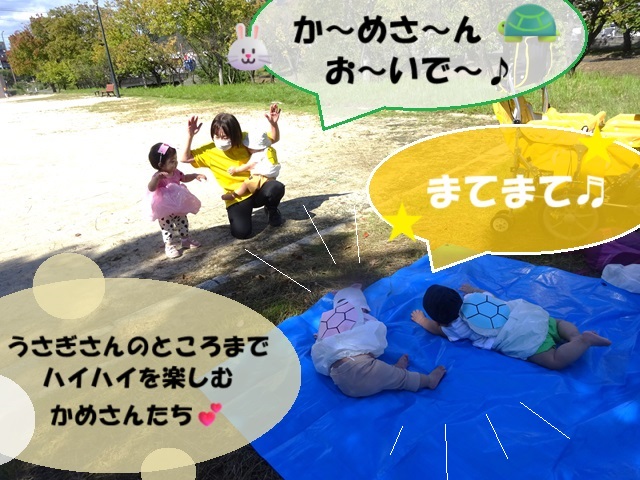 うさぎさんが『カメさんおいで~』と手招きしていました。