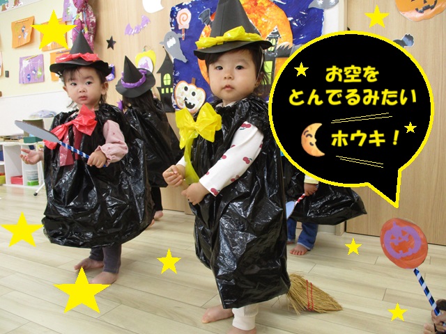 ほうきや手作りステッキを持って、「みてみて〜!」と嬉しそうに見せてくれる姿がとても印象的で、お友だち同士で衣装を見せ合ったり、表現したりすることを楽しんでいました。