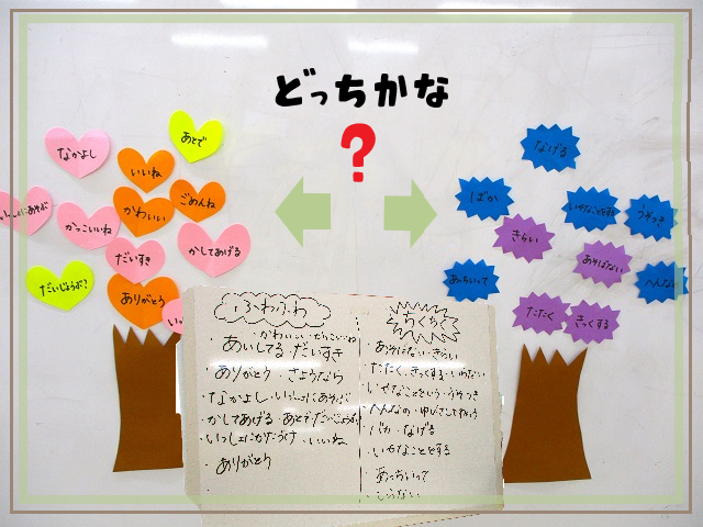 視覚的にも言葉の良し悪しが分かることで「その言葉はちくちく言葉だよ」「今のはふわふわ言葉だね!」と子ども同士で話をする機会が増えました!