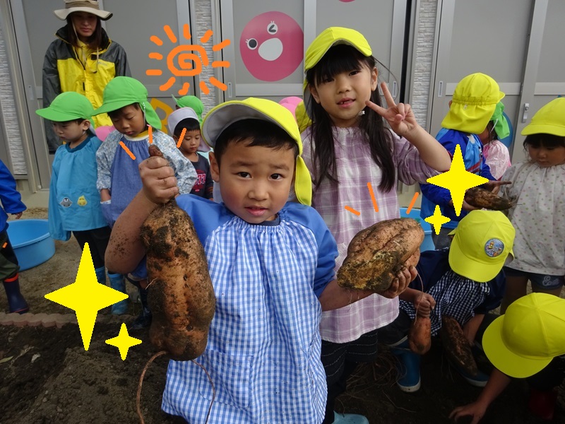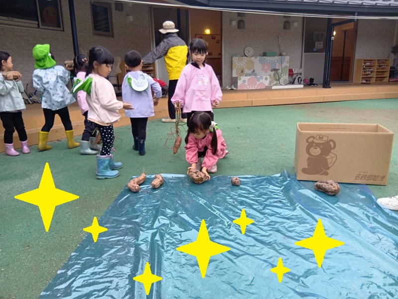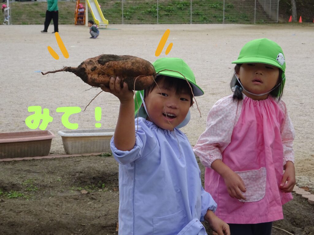 地道な作業を粘り強く行い、ようやくスポッ!と大きなサツマイモが抜けると「やったぁーーー!✨」「みてみて!✨」と嬉しそうな表情でお友だちや保育者に見せられていました。