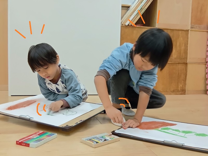 すっかり寒さも増し、園庭の木の葉っぱも緑から黄、赤へと色づいてきて、木の下は落ち葉でいっぱい…。🍂