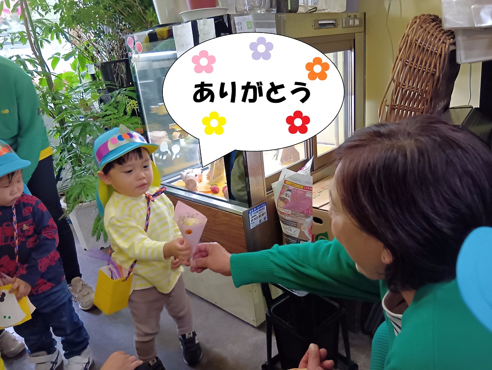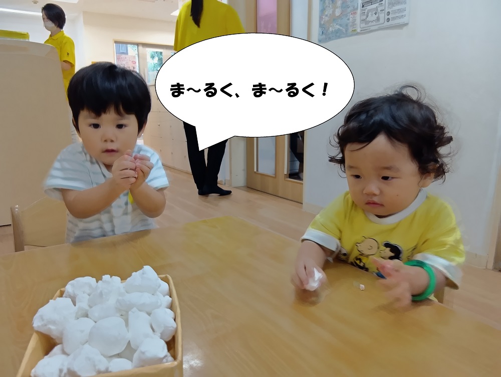 おやつの時間には調理員さんにおやつをもらいに行きました🎶