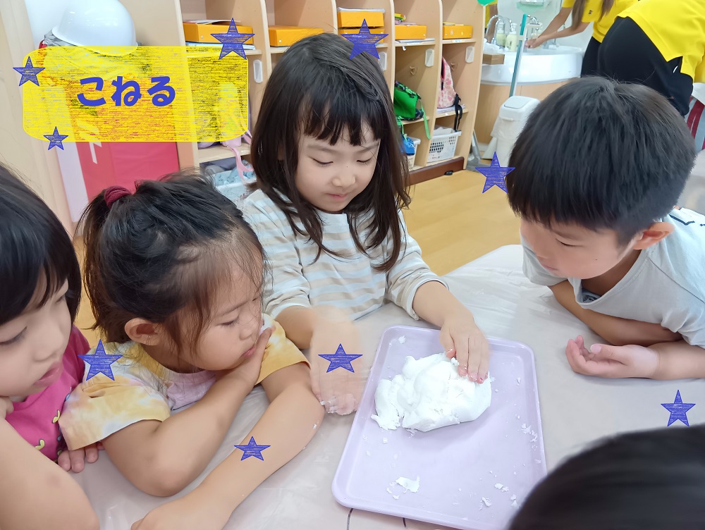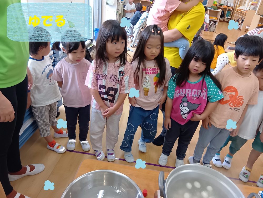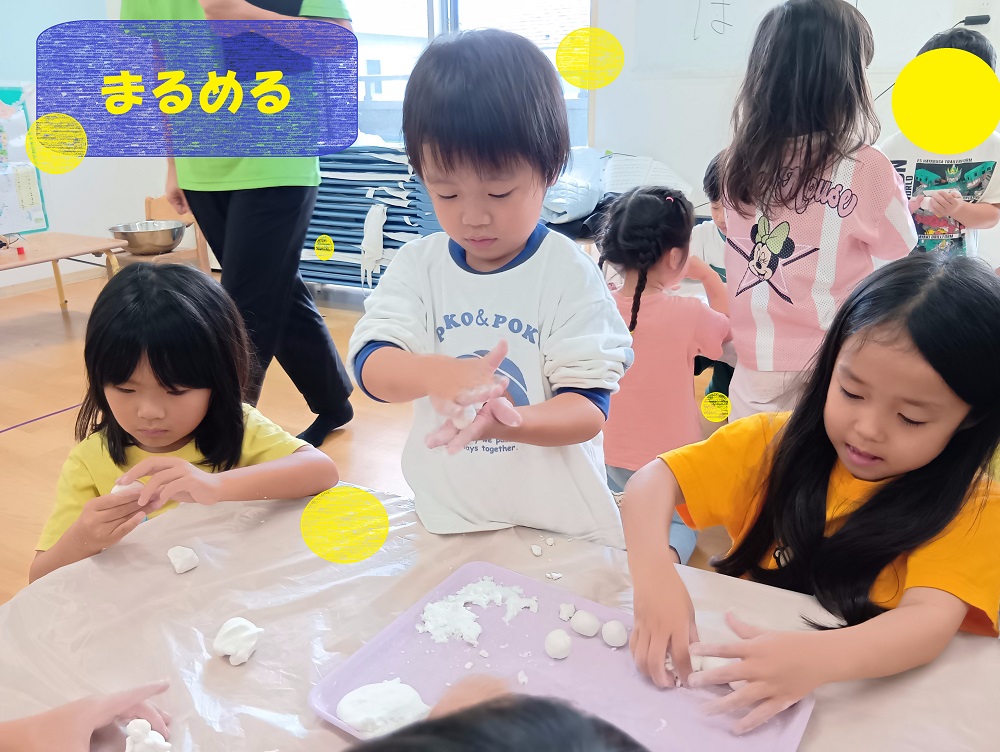 こねたり丸めたりしながら感触を楽しみ、ゆでた後の感触の違いも触って感じることができました✨