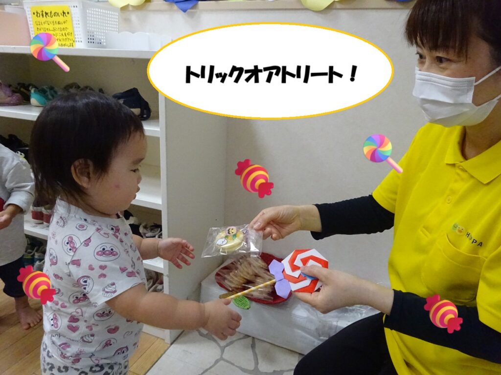 お昼からは給食の先生のところへ行き「トリックオアトリート」と言ってお菓子をもらいました🎃みんな上手に言えましたよ❤