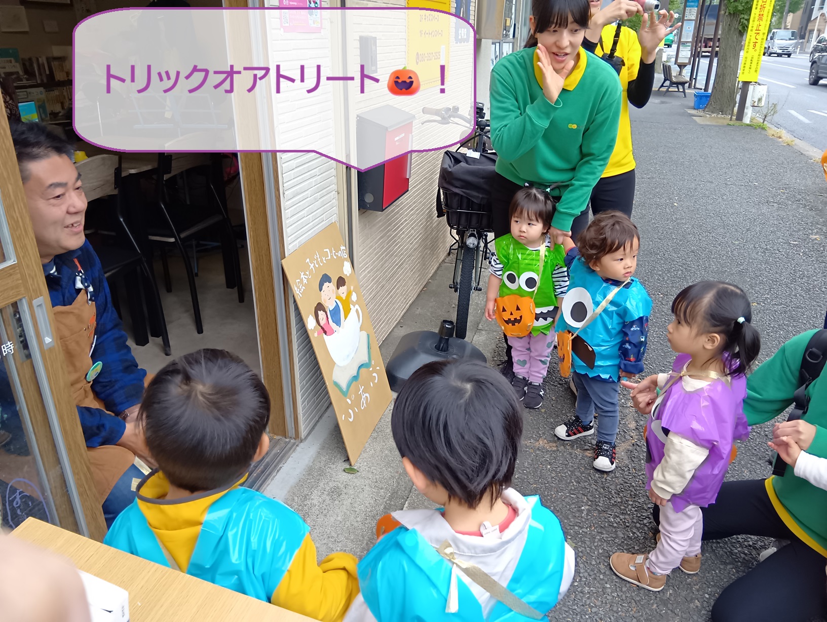 前を通るといつも優しく声を掛けてくれる店員さんに、「トリックオアトリート!」と合言葉を伝えた子どもたち。