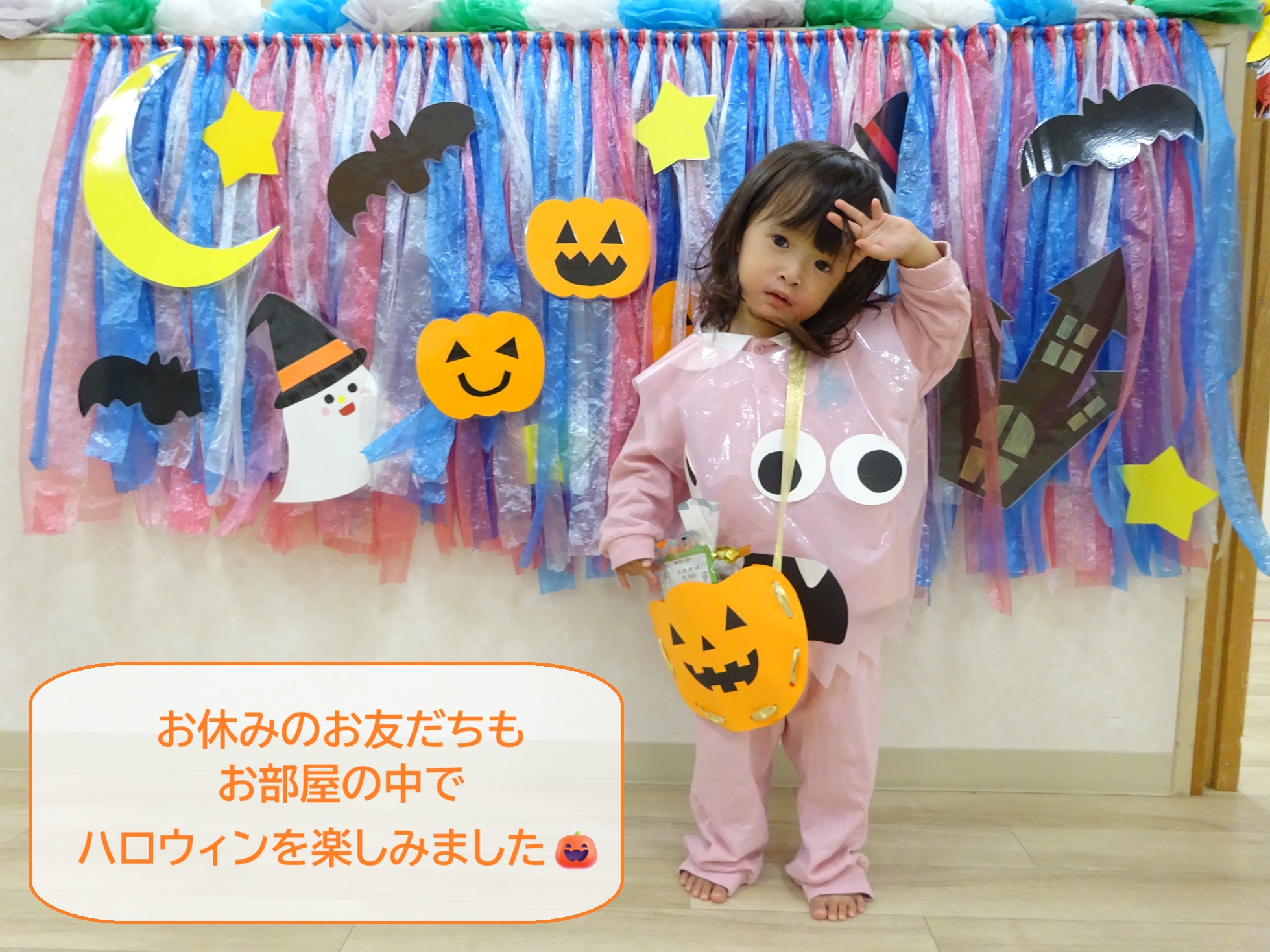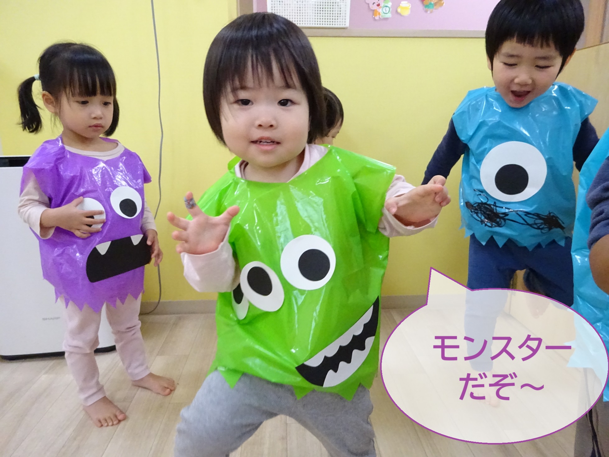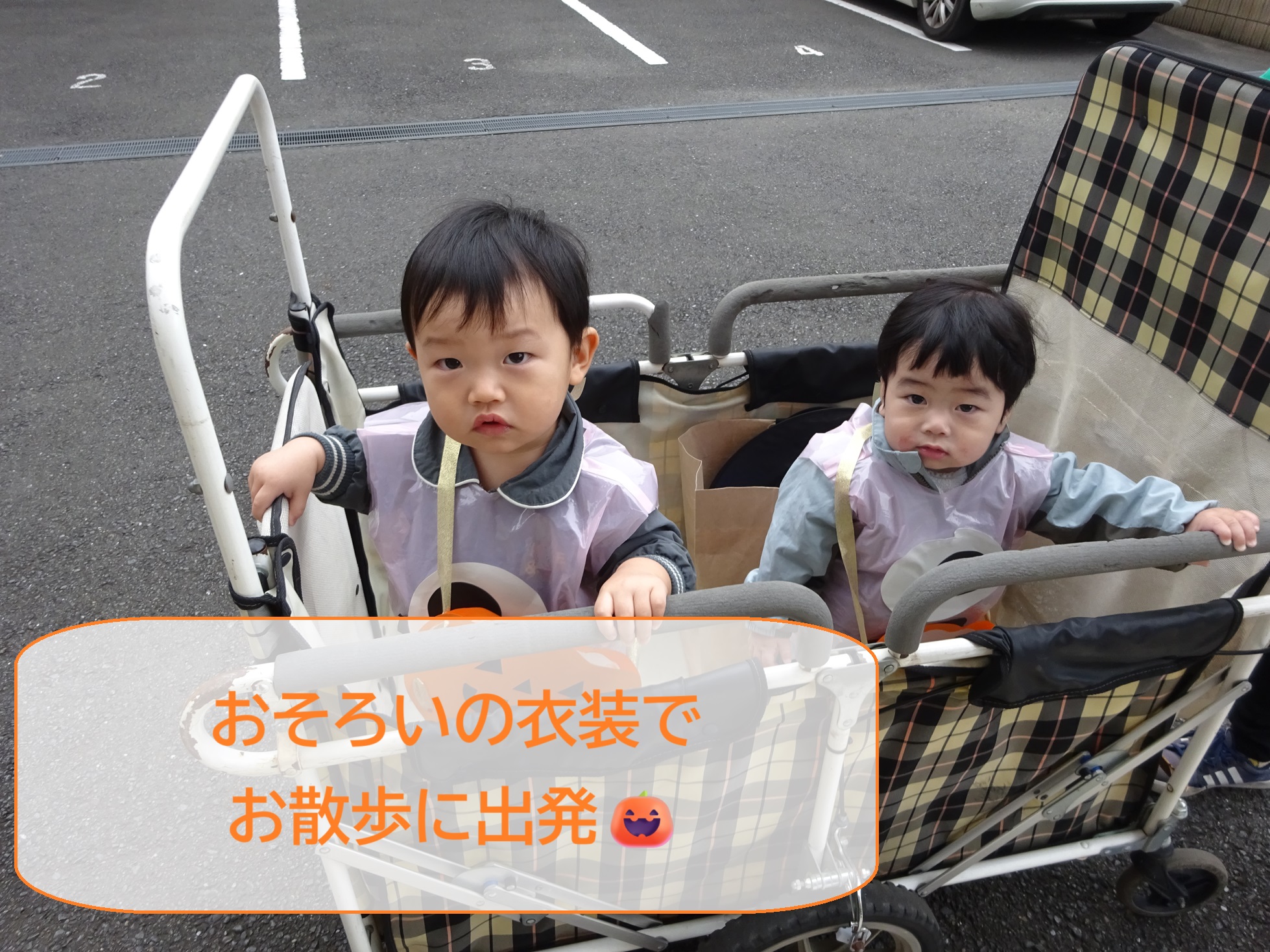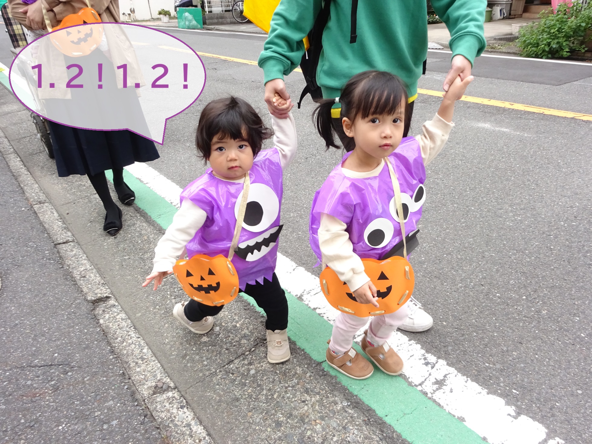 先生の真似っこをして「ハッピーハロウィン!」と挨拶をしたり「モンスター着てるのよ!」と衣装を自慢気に見せたりしながら、いつもとは違うお散歩道を楽しみます🎵