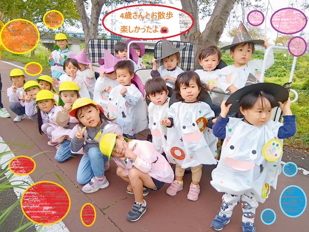 お散歩では4歳児さんと一緒に行き、コスモスやトンボなど秋の自然を感じながらハロウィン散歩を楽しみました🎃