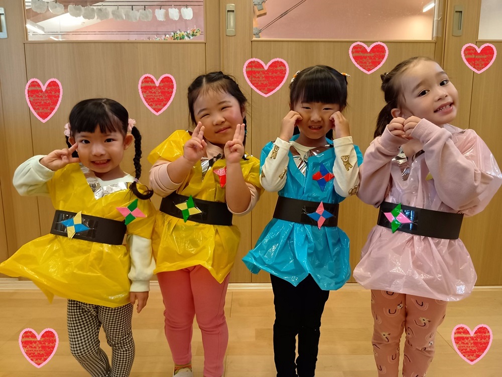 衣装の模様には子どもたちが画用紙に自由にペンで描いた画用紙を貼り、ひとりひとりのオリジナリティあふれる衣装になりました👏