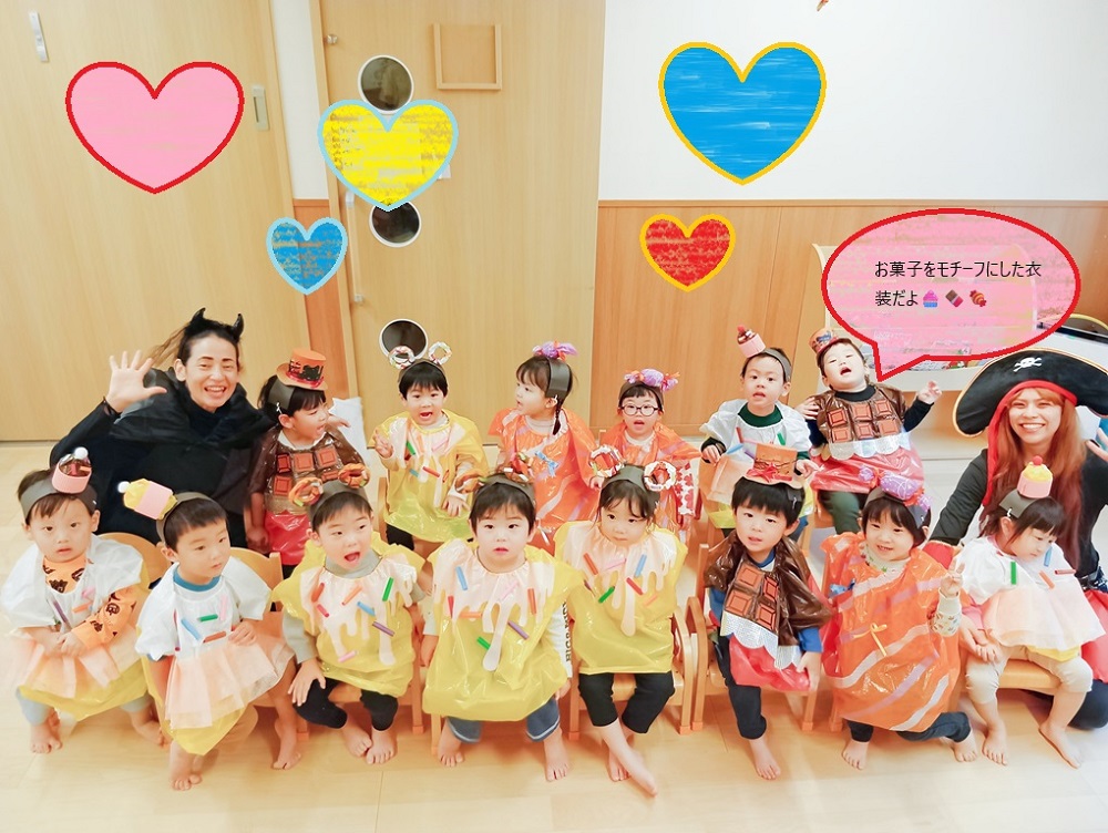ハロウィンに出てくるかぼちゃやおばけに興味を持ちEnglish timeの歌にもおばけが出てくると真似をして楽しんだり、ままごと遊びの中で、キャンディー🍭やドーナツ🍩にも興味があり、子どもたちの好きな物がたくさん詰まった衣装になりました🌟