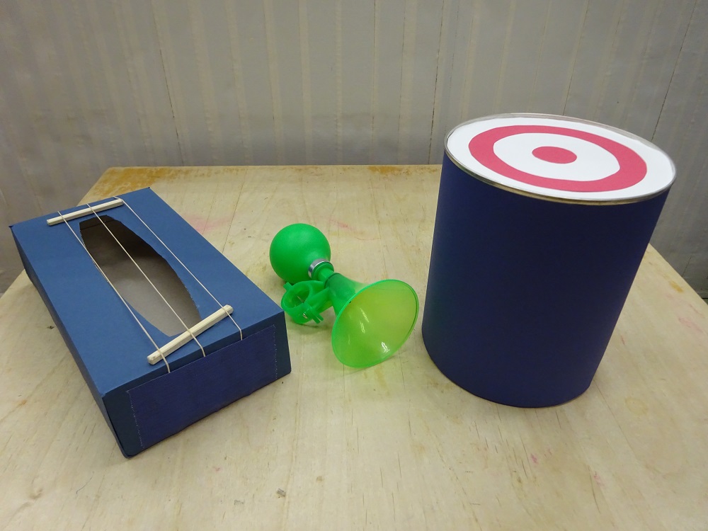 用意したのは、ミルク缶太鼓、輪ゴム琴、エアホーンの3種類。