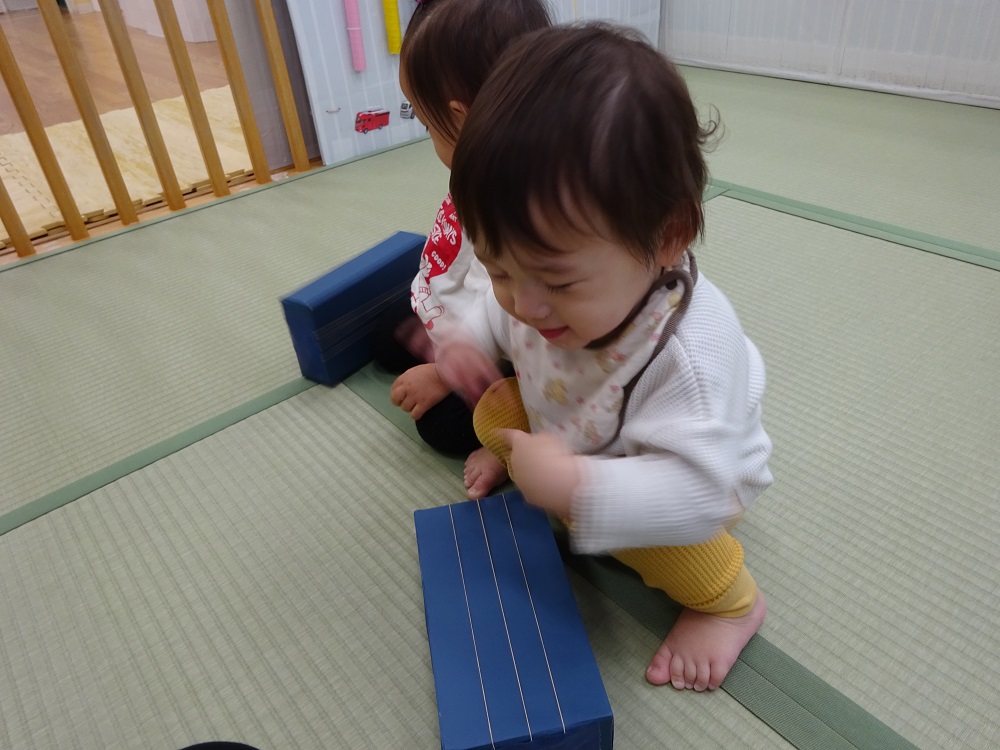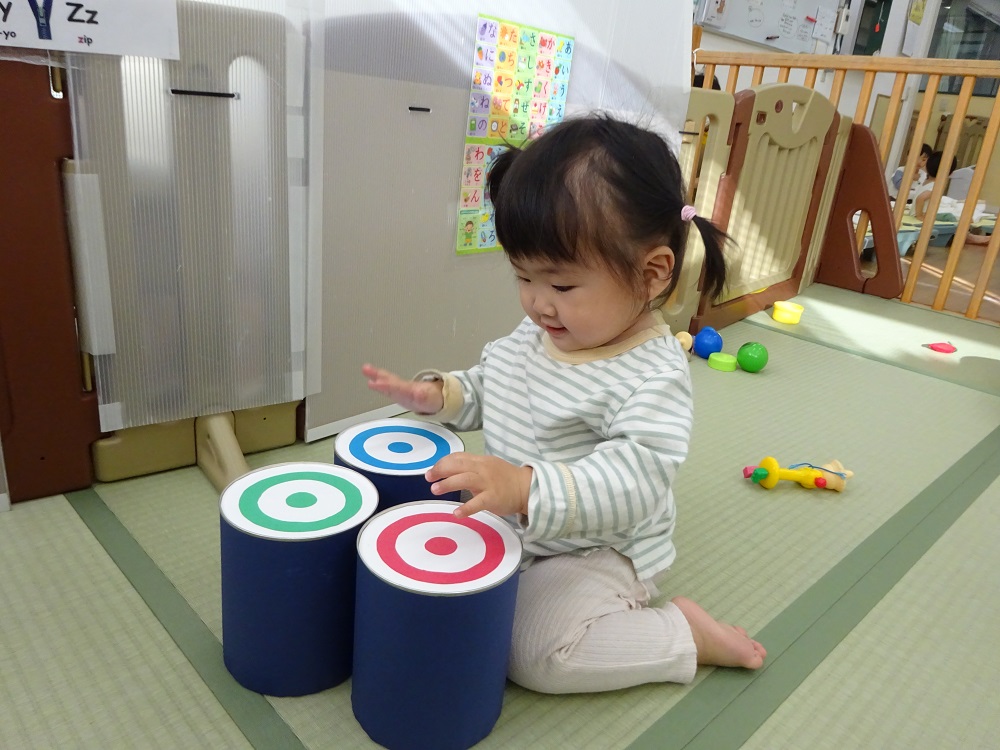 保育士が叩いてみると、真似をして手のひらで「ポンッ」と叩きました。