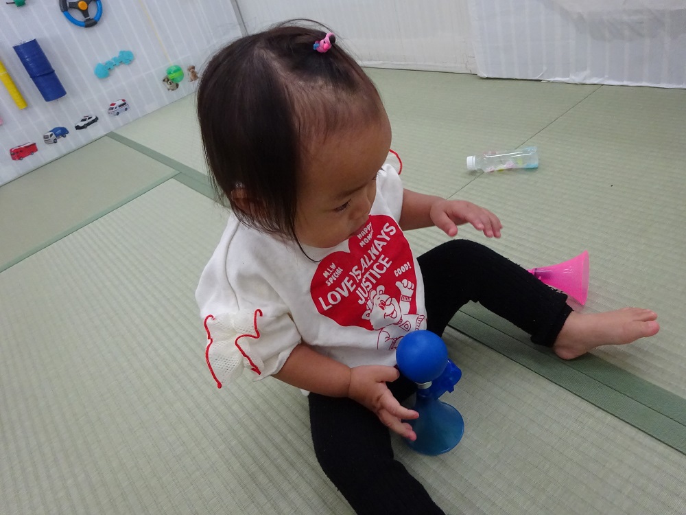 保育士が「プー」と音を出すと早速真似をしてゴムを潰してみます。