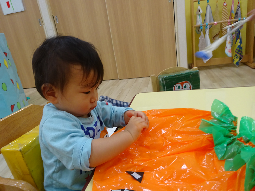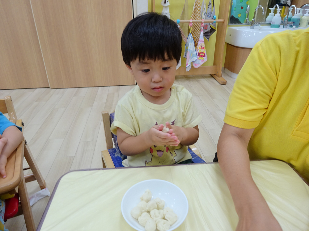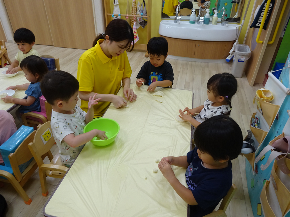 スピカ組・ベガ組(0・1歳児)のお友だちは、初めての感触にドキドキしてツンツンと触るだけのお友だちもいましたが、上手にこねこねできるお友だちもいました。